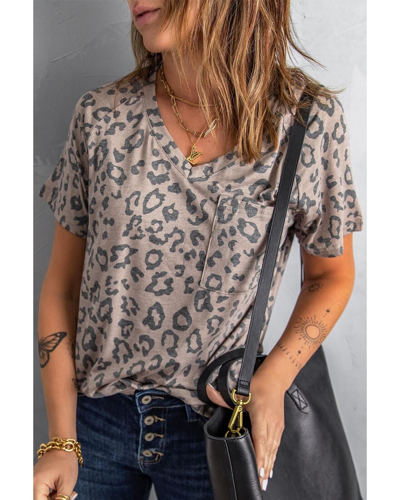 Azura Exchange Leopard Print V Neck Tee with Front Pocket
