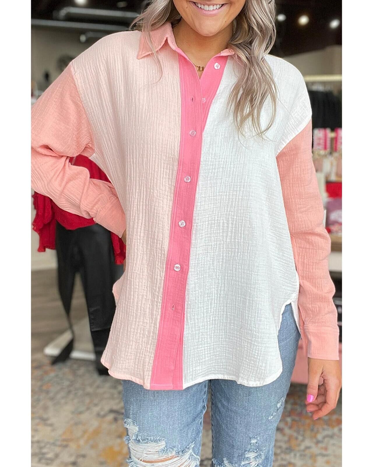 • Pink Color Block Patchwork Crinkle Long Sleeve Shirt