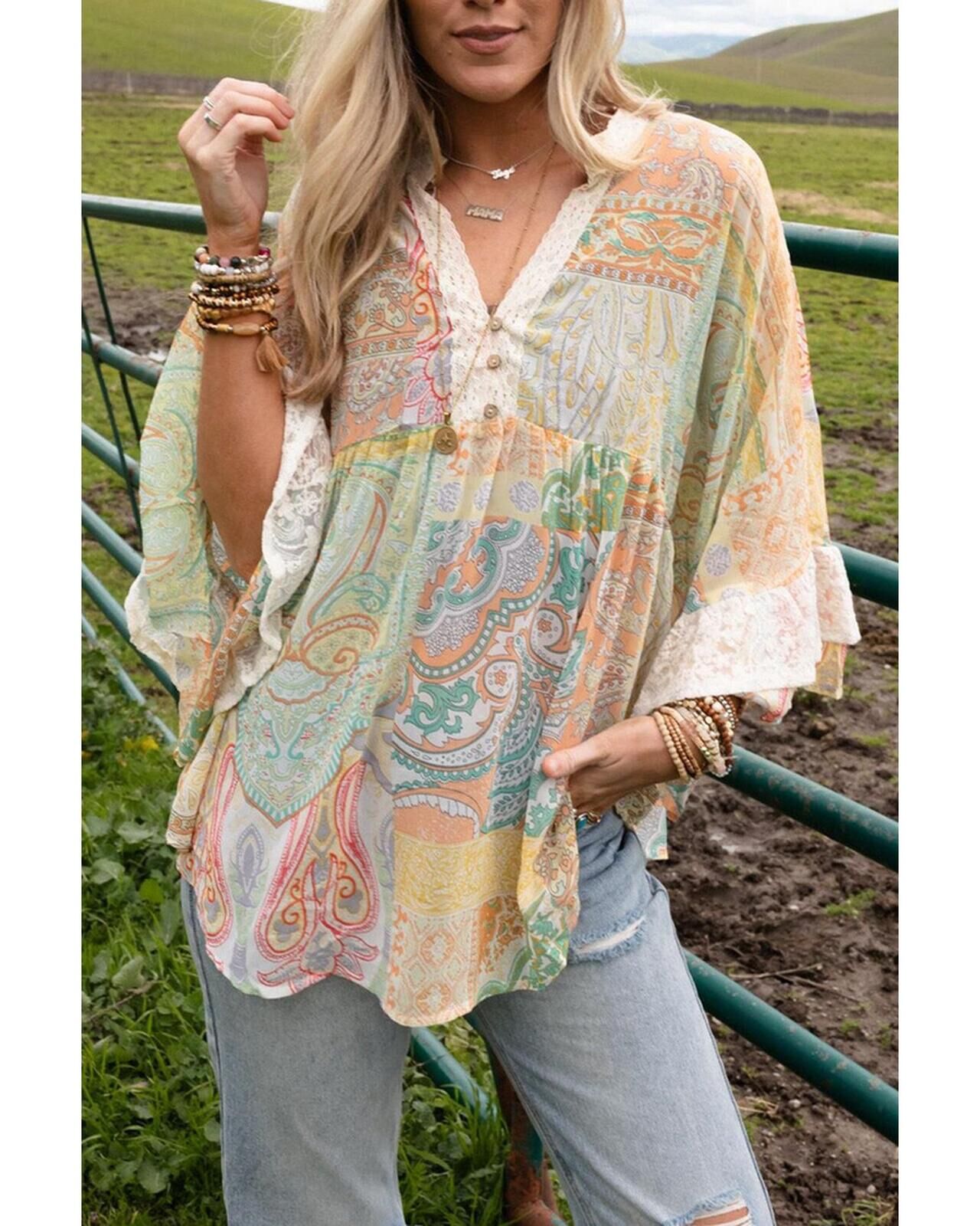 Azura Exchange Paisley Print Bell Sleeve Sheer Blouse