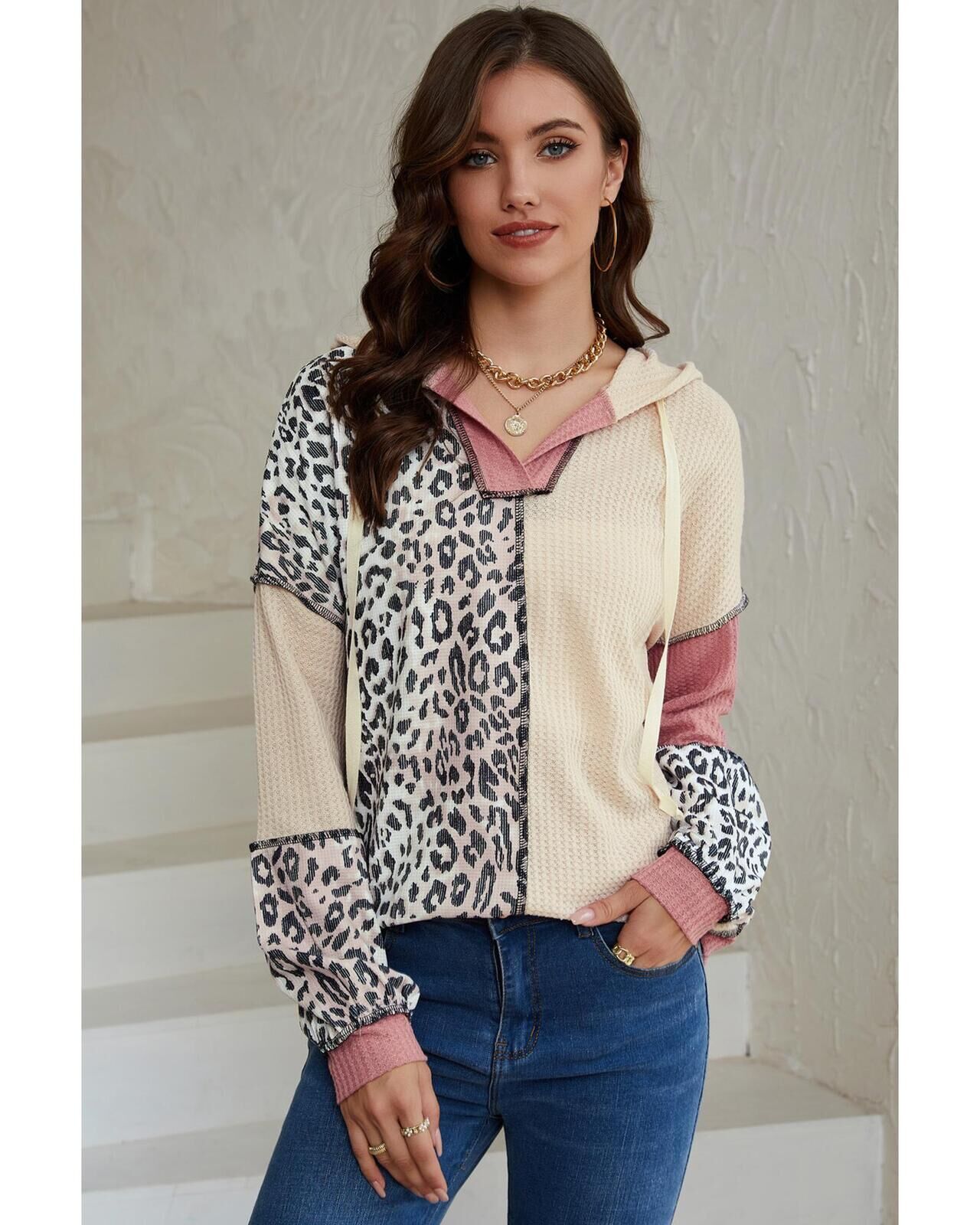 • Womens Colorblock Patchwork Waffle Knit Hoodie