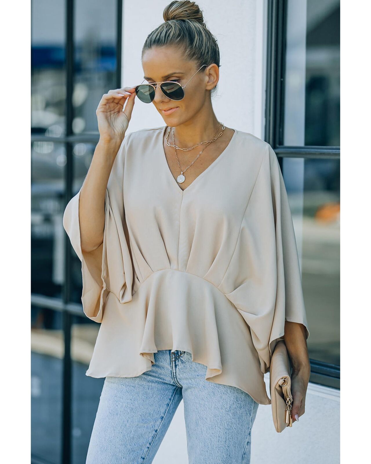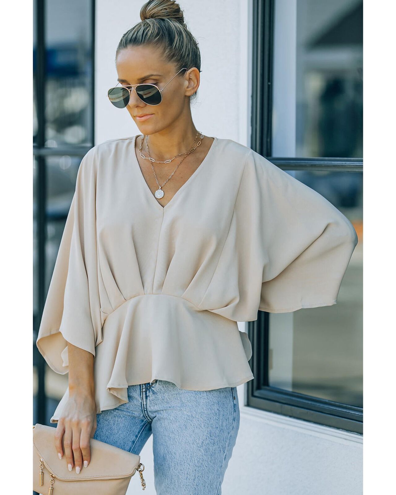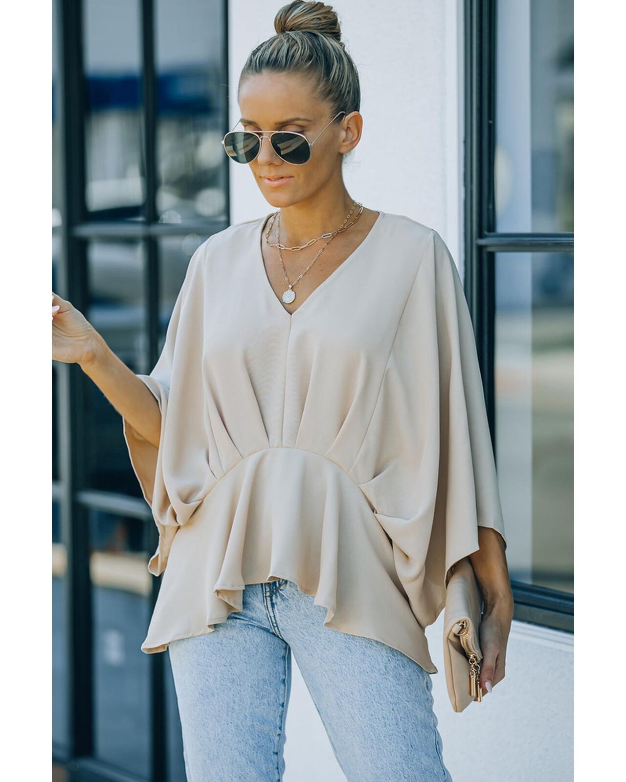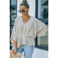 Azura Exchange Pleated Batwing Sleeve V Neck Blouse in 100% Polyester - M