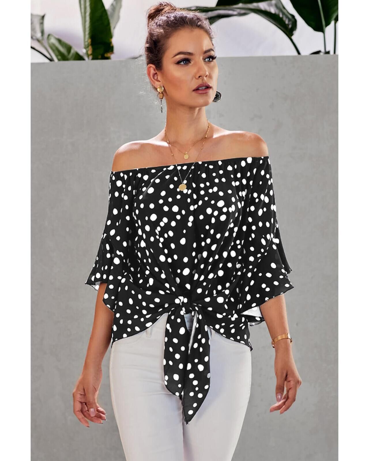 • Polka Dot 3/4 Bell Sleeve Off Shoulder Front Tie Knot Top