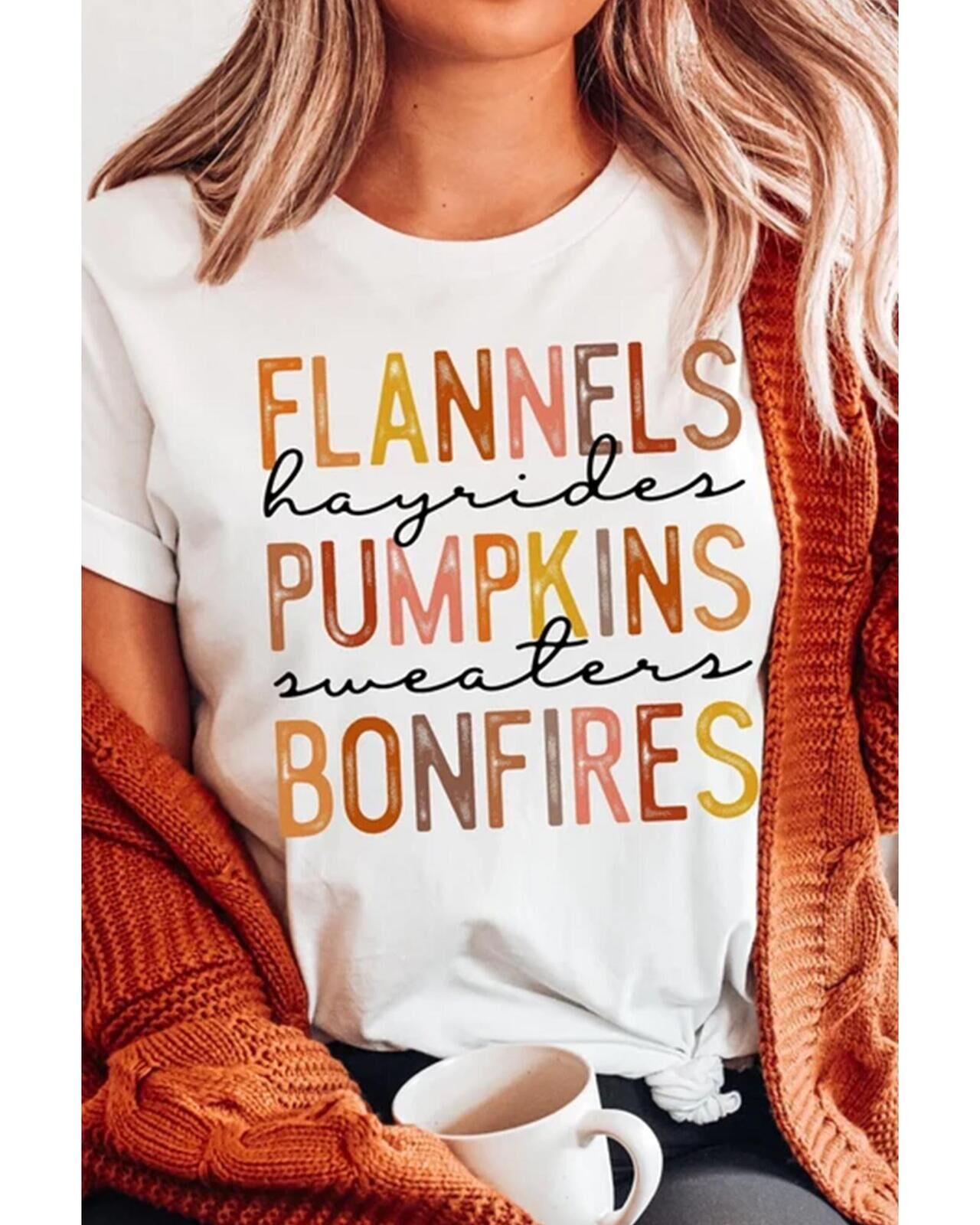 • Womens Flannels Pumpkins Bonfires Letter Graphic Tee