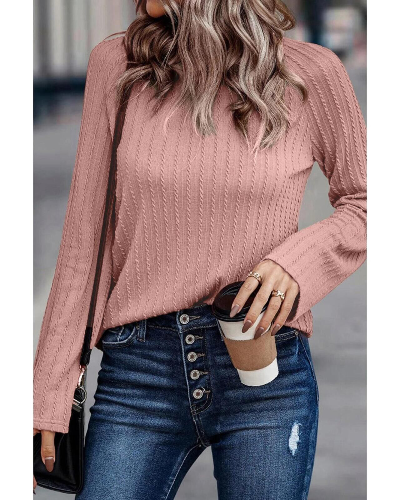 • Pink Ribbed Round Neck Knit Long Sleeve Top