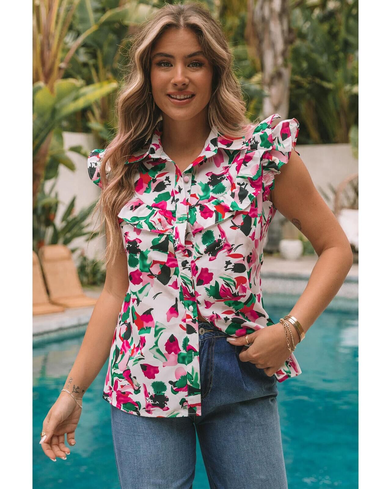 Azura Exchange Ruffled Sleeveless Shirt with Floral Print