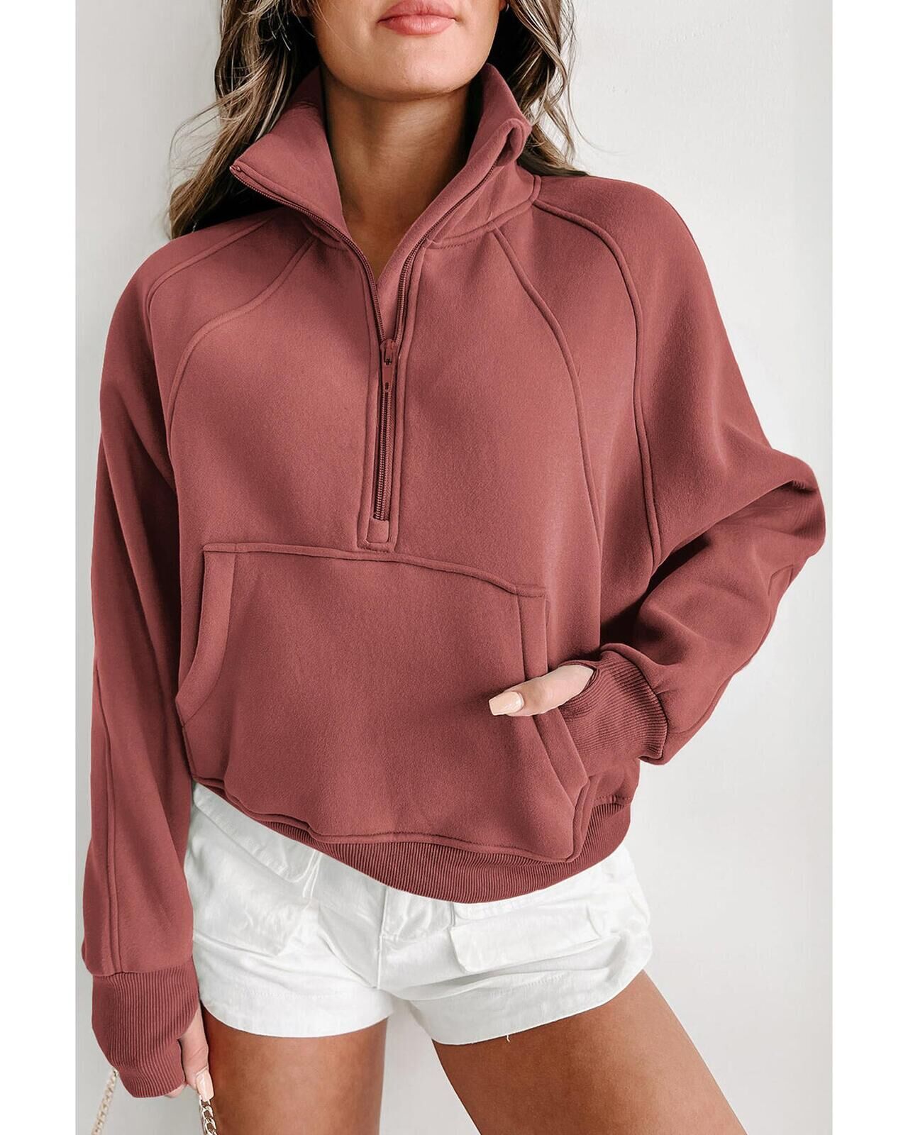• Brown Zip Up Stand Collar Ribbed Thumbhole Sleeve Sweatshirt