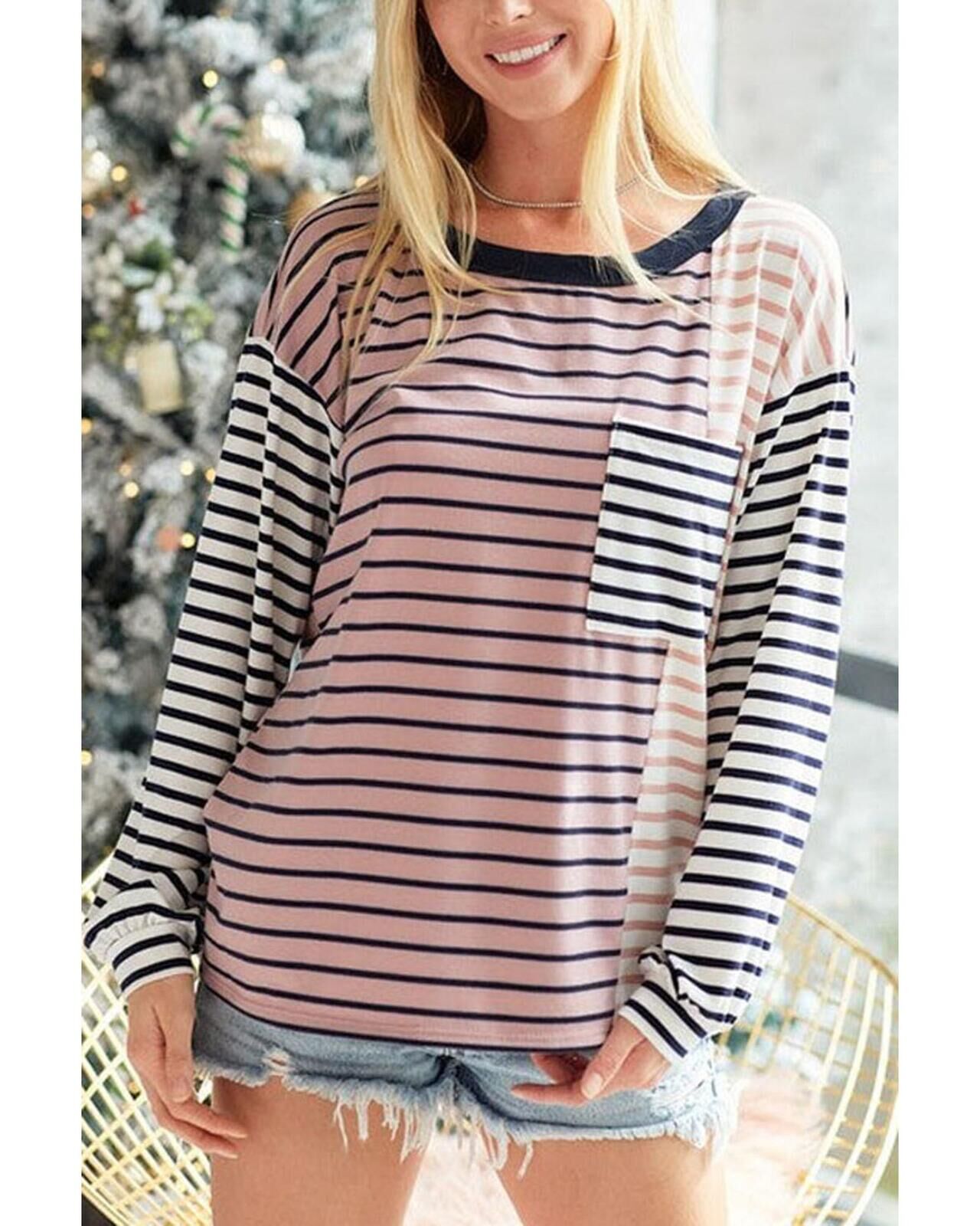 Azura Exchange Striped Patchwork Pocketed Long Sleeve Top