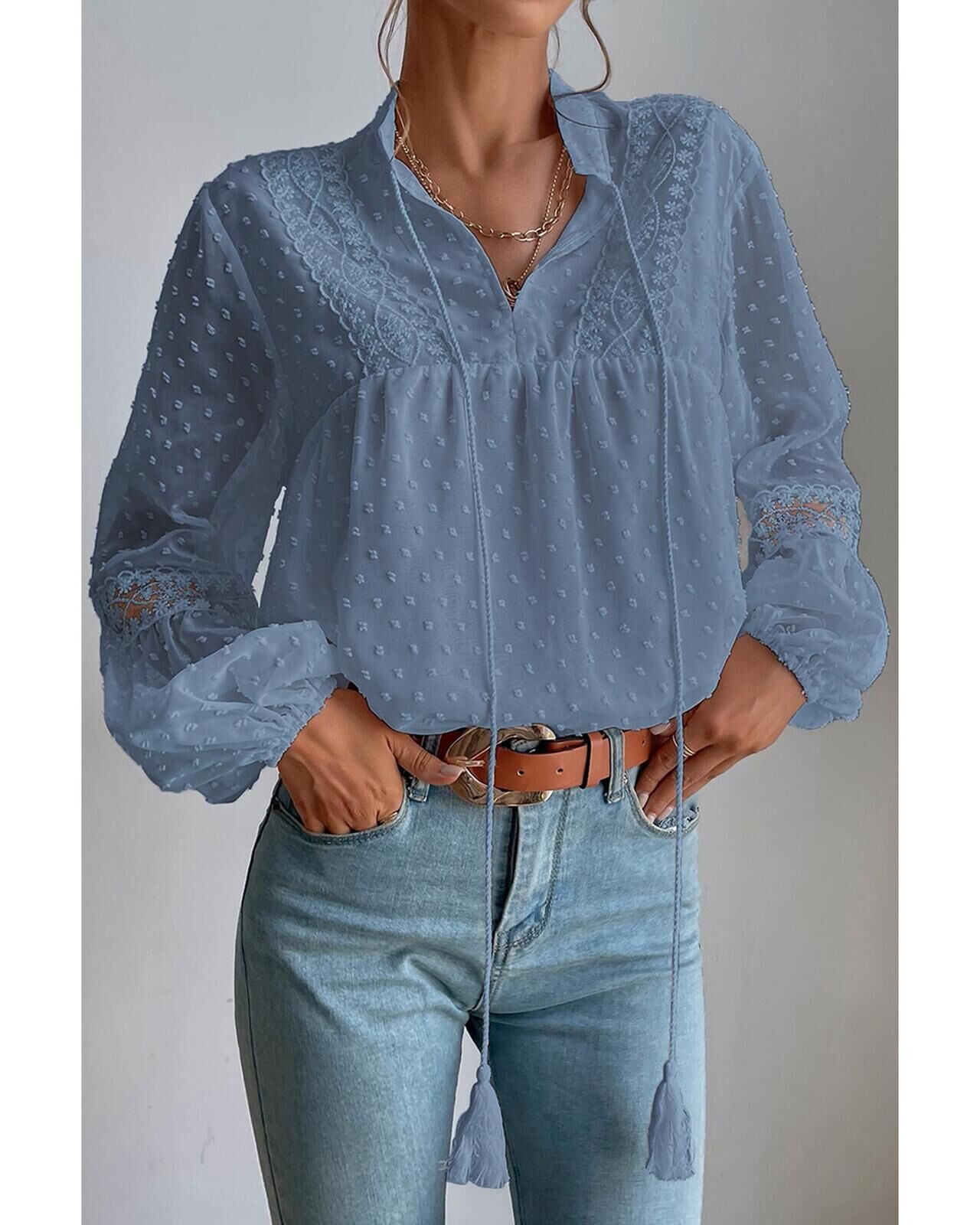 • Luxurious Swiss Dot Drawstring Balloon Sleeve Babydoll Blouse