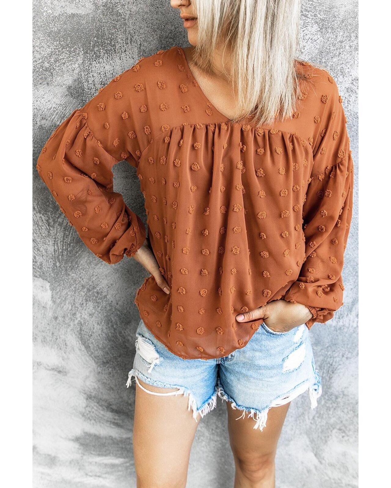• Swiss Dot V Neck Puff Sleeve Babydoll Shirt
