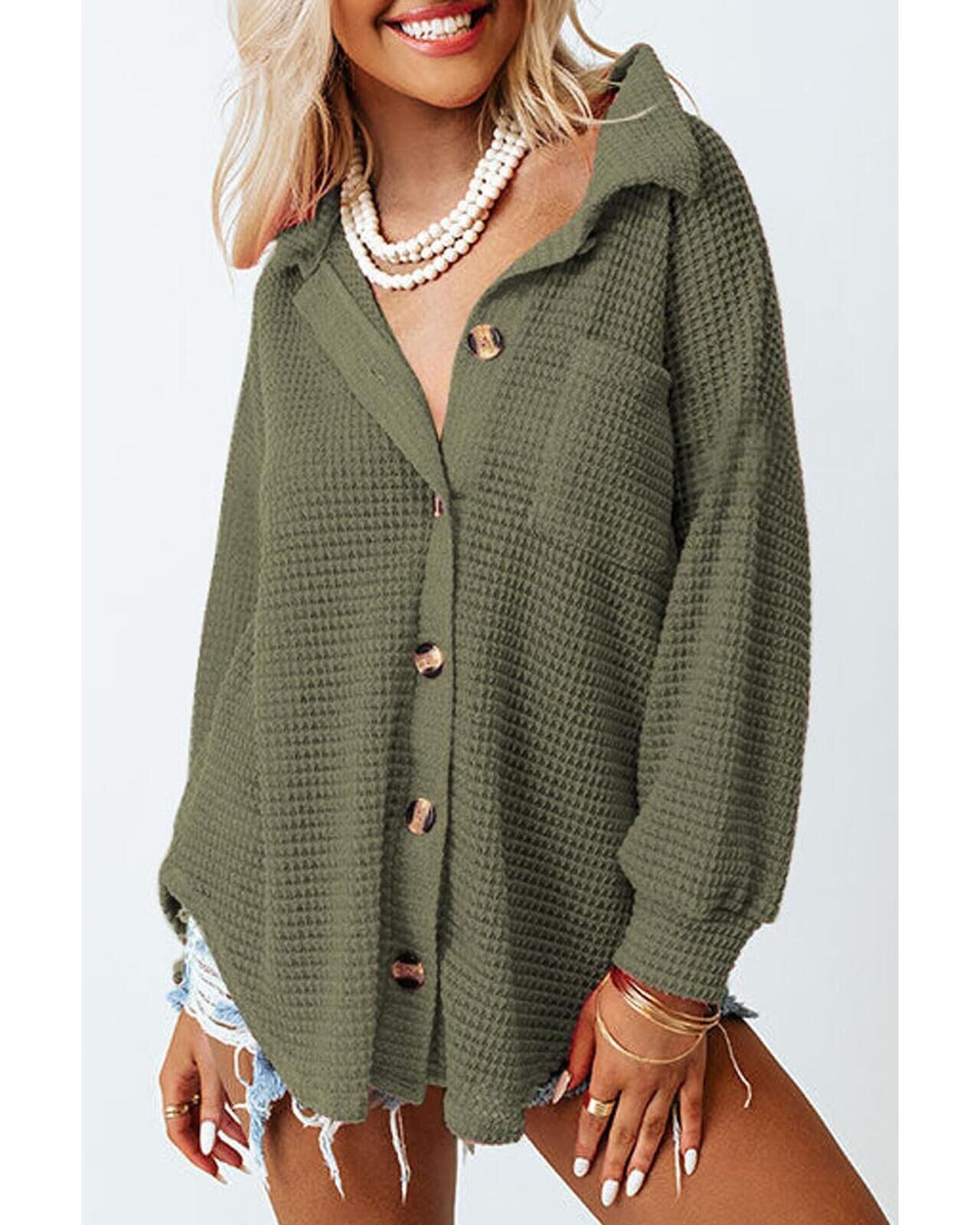 Azura Exchange Textured Green Waffle Knit Button Up Shirt