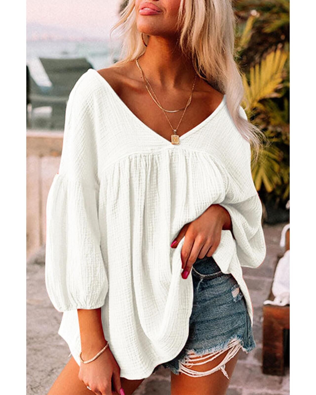 • Versatile and stylish White Textured V Neck Bracelet Sleeve Babydoll Blouse