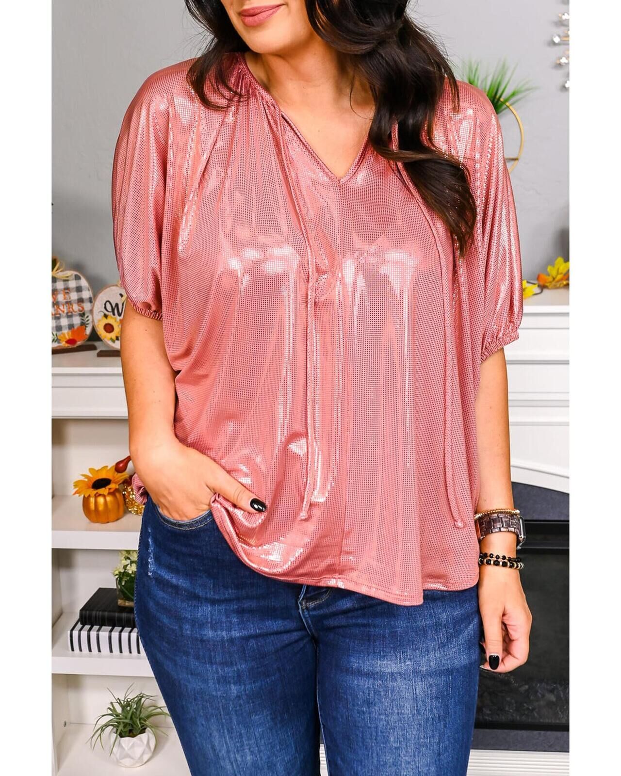 Azura Exchange V Neck Metallic Short Sleeve Top