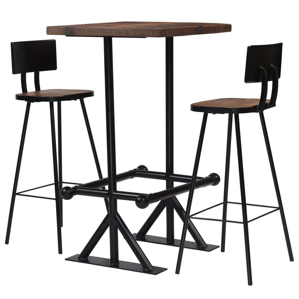 $561.17This wooden bar set in a retro look oozes industrial style and will make a striking addition to your decor. The bar table and chairs are made of solid reclaimed wood that has been sourced from joists, floors and support beams from old buildings being demolished, and can consist of different types of wood like pine, teak, beech, oak, cedar, mango wood, acacia, etc. This means the reclaimed wood retains the characteristics of these different types of wood. Reclaimed wood is already aged, weathered and dried, so it doesn't shrink or bend. The beautiful wood grains make every piece of furniture unique and slightly different from the next. Signs of wear and visible grain structure also give the set its own history and a unique look. Every step of the process is carried out with the greatest care, be it polishing, painting or lacquering. The steel frame ensures the set's sturdiness and stability but contributes to its industrial style as well. The footrests add to the seating comfort. Assembly is easy. Delivery includes 1 bar table and 2 bar chairs. Important note: Colours vary from piece to piece, making each of our items unique; the delivery is random.