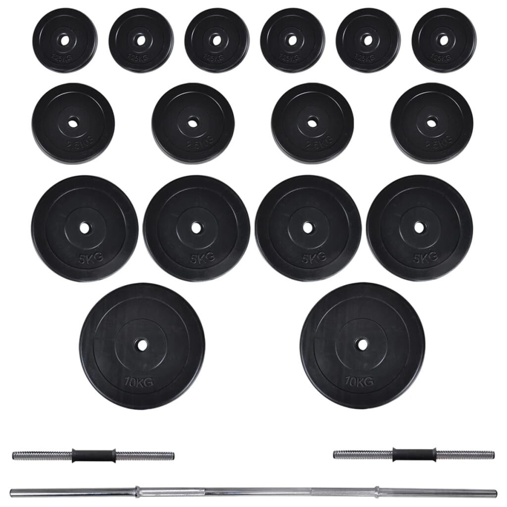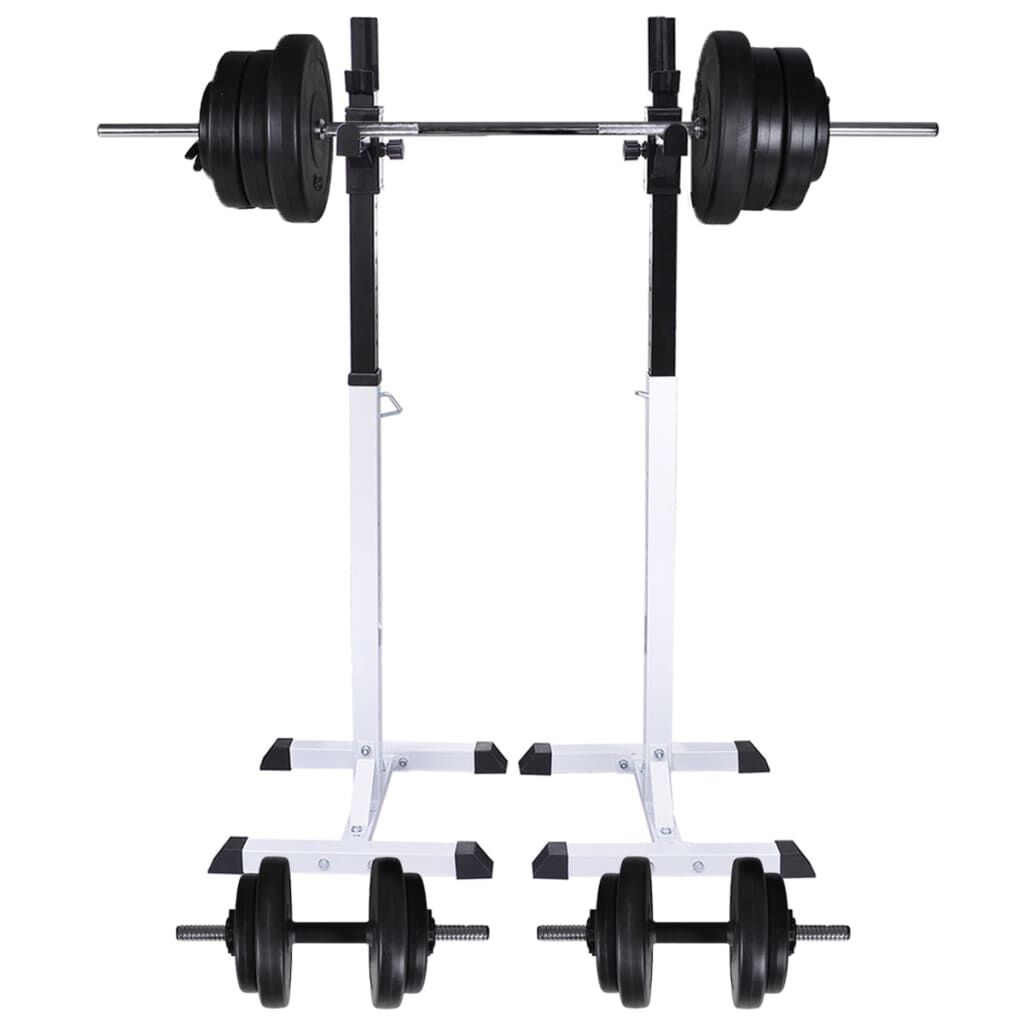 This robust and stable barbell/squat rack with a barbell and dumbbell set is perfect for your home gym! In combination with a workout bench, it will be suitable for bench press training as well as squats. This stable barbell rack is suitable for barbell bars with a diameter of approximately 45-50 mm. It has a rugged steel construction and a maximum load capacity of 80 kg. The rack is adjustable in height and suitable for almost any body size and various exercises. Moreover, it is compact and space saving. The barbell and dumbbell set features solid chrome-plated bars with quick-action spring collars (for barbell bar), non-slip knurled grips, and fluted star-screw caps (for dumbbell bars) for secure attachment of the weight plates. You can work out without worrying about safety issues. The weight plates are made with a robust polyethylene casing. They can be combined in various ways for different training purposes. Delivery includes a barbell/squat rack, a barbell bar, two dumbbell bars, six 1.25 kg weight plates, four 2.5 kg weight plates, four 5 kg weight plates, two 10 kg weight plates, four caps and two spring collars.