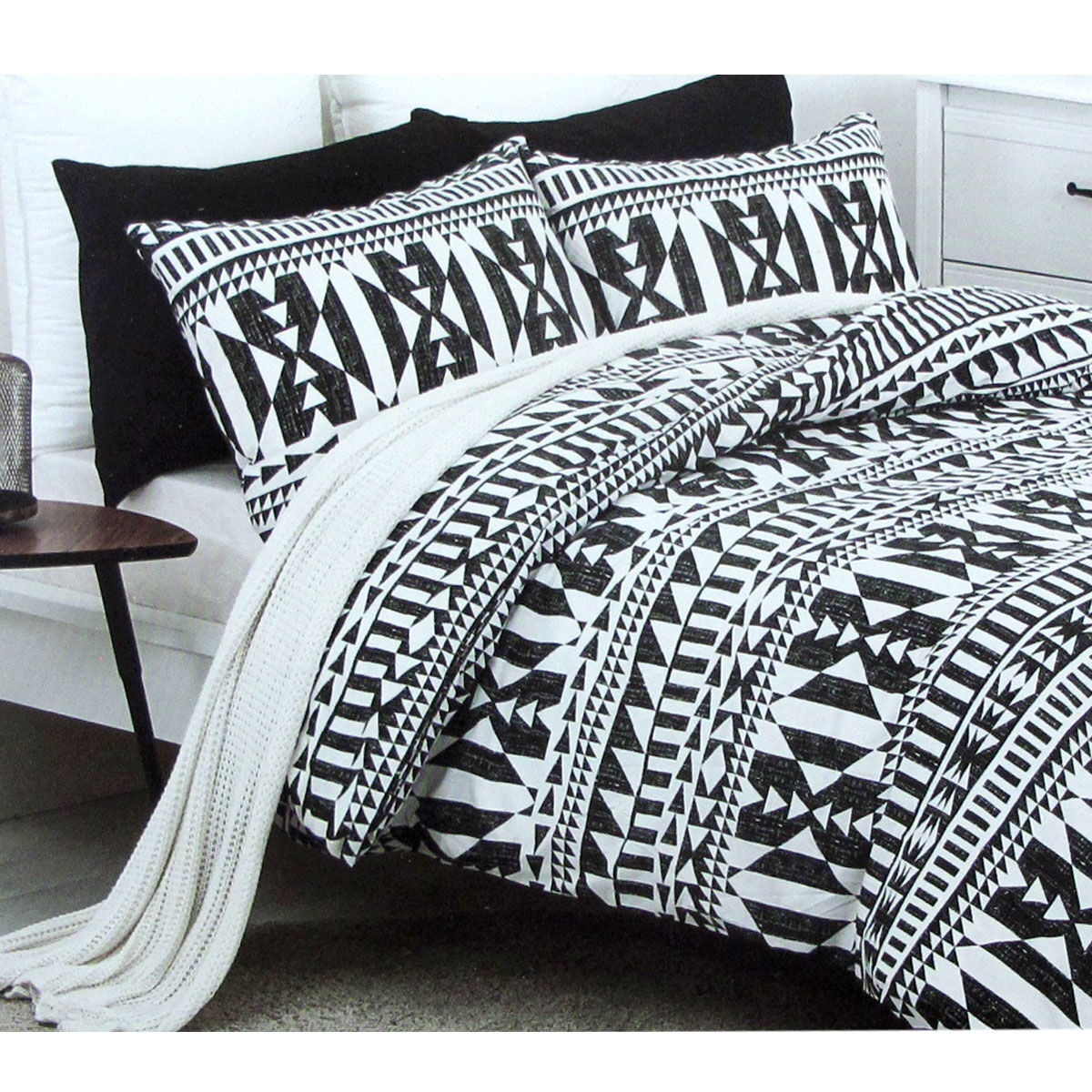 Add a personal touch to your bedroom with this unique design Barundi Tribal Easy Care Quilt Cover Set Queen by Belmondo. The quilt cover features a stylish tribal design printed in soft colour hues of white, charcoal, and black that will give your bedroom an easy update. It is made from quality and soft touch polyester cotton fabric with easy care properties you can enjoy for years to come.