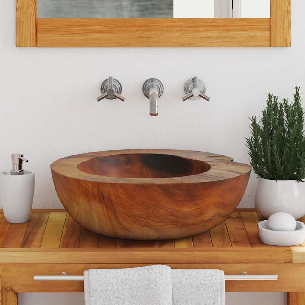 This unique wash basin, made of solid teak with a water-repellant finish, exudes a rustic charm and is a real eye-catcher in your bathroom or washroom. It should be mounted above counter. This striking basin is not only a practical sink for everyday use, but also an adornment for your living space. It is fully handmade and the craftsmanship adds to its spectacular retro and natural style. It will definitely suit any interior style. In addition, the basin is very easy to clean. Important note: As wood is a natural product, the colours, grain patterns and shapes vary from piece to piece, making each of our wash basins unique and different from the next. The delivery is random, ensuring the exclusivity and individuality of your product.