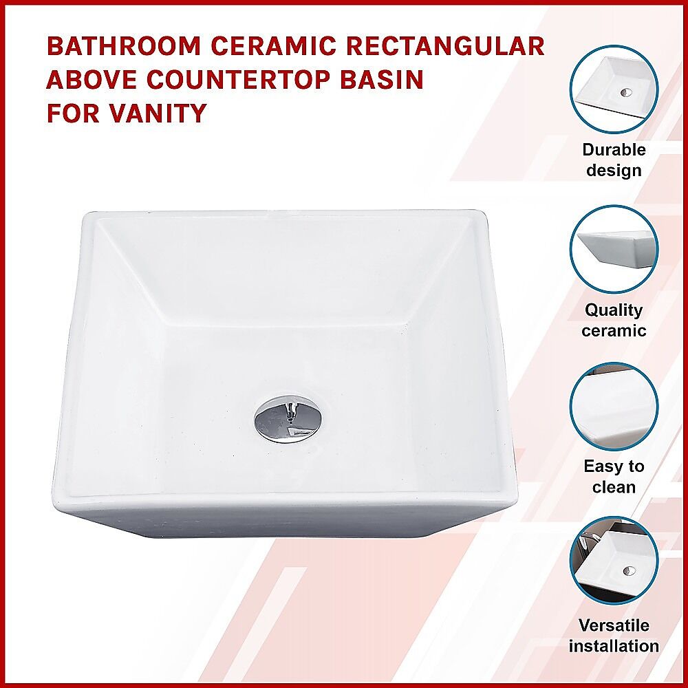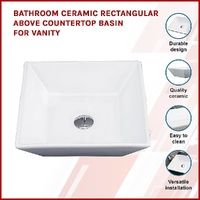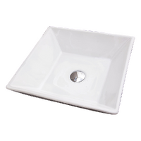 This attractive above-the counter basin is made from a ceramic construction. The basin is rectangular in shape and measures 415mm x 415mm x 120 mm.