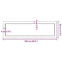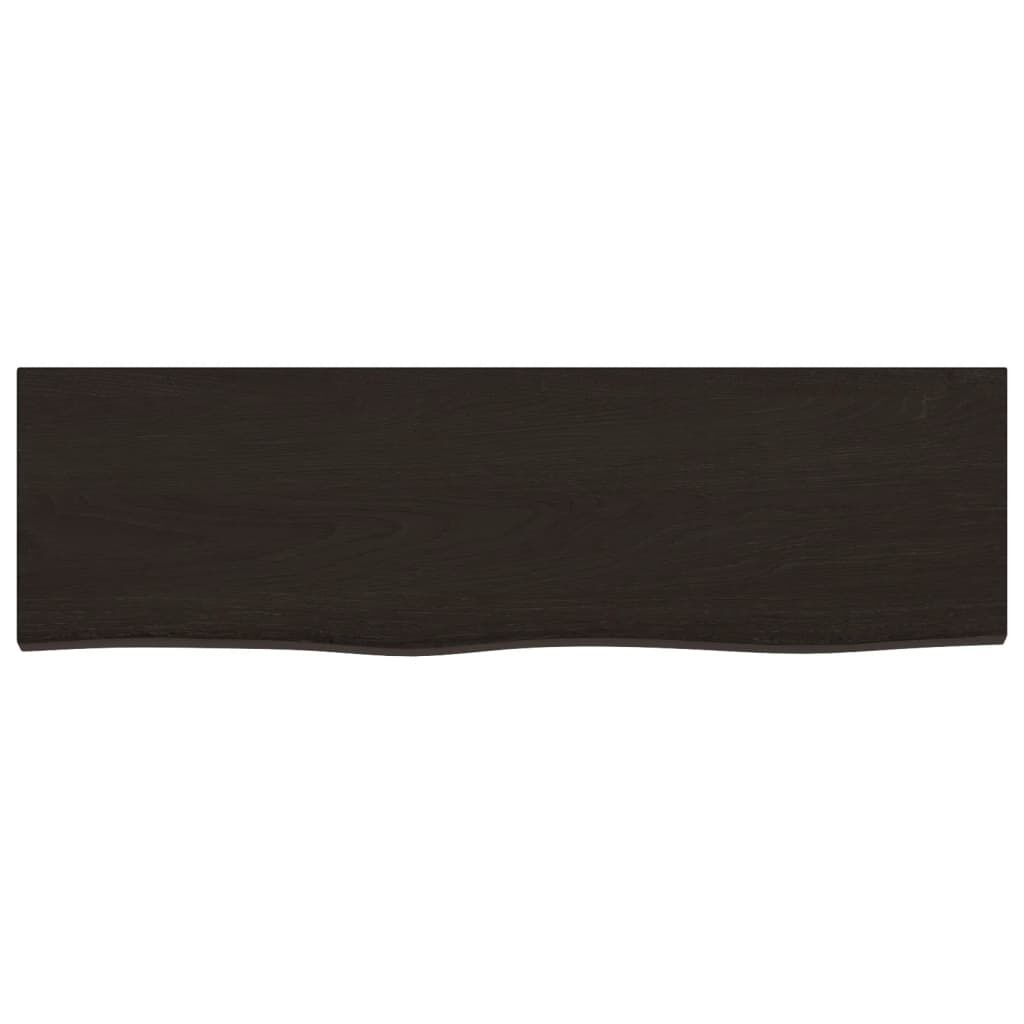 Are you planning to renovate your countertops at home? This wooden bathroom countertop is a perfect choice! Durable construction: This bathroom worktop is made of solid oak wood, which is a beautiful natural material. Oak wood has a medium brown colour and a dense grain, contributing to its unique look.Versatile applications: Besides a bathroom vanity top, this wooden countertop can be combined with different bases according to your needs. It can be used as a shelf, cabinet top, desk top, table top etc.Treated surface: The bathroom top has been treated with dark paint, so it is ready for use as an additional finish is not required.Handmade with live edge: This bathroom vanity countertop is handmade with a live edge. Due to that the knots, cracks, slightly curved shapes, and colour tones are part of the oak wood, every piece of oak countertop has its own unique character to display. The delivery is random. Good to know:As a natural product, wood may show knots and imperfections that we fill with black fillings to ensure a smooth appearance.