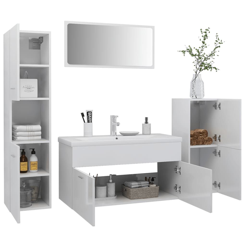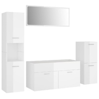 With this stylish bathroom furniture set, you can create additional storage space for your bathroom with a striking, tidy appearance. The clean lines and sleek design blend into your bathroom perfectly. The furniture set consists of a sink cabinet, a low cabinet, a high cabinet, and a mirror. The chic basin cabinet has 1 compartment, and the top of it is ideal for placing the sink. The high cabinet features a total of 5 compartments and 2 doors while the low cabinet has 2 compartments. These 2 cabinets offer various storage options and extra space to store items in your bathroom. The mirror also adds an excellent appearance to your home decor. Additionally, this bathroom set is easy to clean with a damp cloth. Please note: The sink, tap, and drain are not included in the delivery.