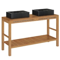 This stylish wooden bathroom cabinet with two sinks with a beautiful yet simplistic style is a perfect match for your bathroom or washroom decor. The sink cabinet is constructed from solid teak wood which is durable and sturdy enough to place a basin on the top, including other bathroom accessories. The vanity cabinet has a handrail for hanging towels or clothes. It also has four supporting legs to ensure stability and dryness above the ground. The striking basin is user-friendly for everyday use and is a wonderful adornment for your living space. Fully handmade of graceful marble, the basin is extremely sturdy with an elegant look. Additionally, the washbasin is very easy to clean. The cabinet fits perfectly under your sink and makes bathroom storage quite convenient. Note: Marble is a natural product and colour differences might therefore occur. The real product might be lighter or darker than in the photos and sometimes there might be a mix of colours in the product.