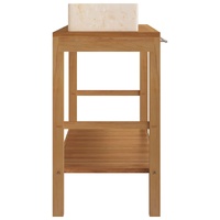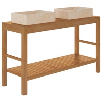 This stylish wooden bathroom cabinet with two sinks with a beautiful yet simplistic style is a perfect match for your bathroom or washroom decor. The sink cabinet is constructed from solid teak wood which is durable and sturdy enough to place a basin on the top, including other bathroom accessories. The vanity cabinet has a handrail for hanging towels or clothes. It also has four supporting legs to ensure stability and dryness above the ground. The striking basin is user-friendly for everyday use and is a wonderful adornment for your living space. Fully handmade of graceful marble, the basin is extremely sturdy with an elegant look. Additionally, the washbasin is very easy to clean. The cabinet fits perfectly under your sink and makes bathroom storage quite convenient. Note: Marble is a natural product and colour differences might therefore occur. The real product might be lighter or darker than in the photos and sometimes there might be a mix of colours in the product.