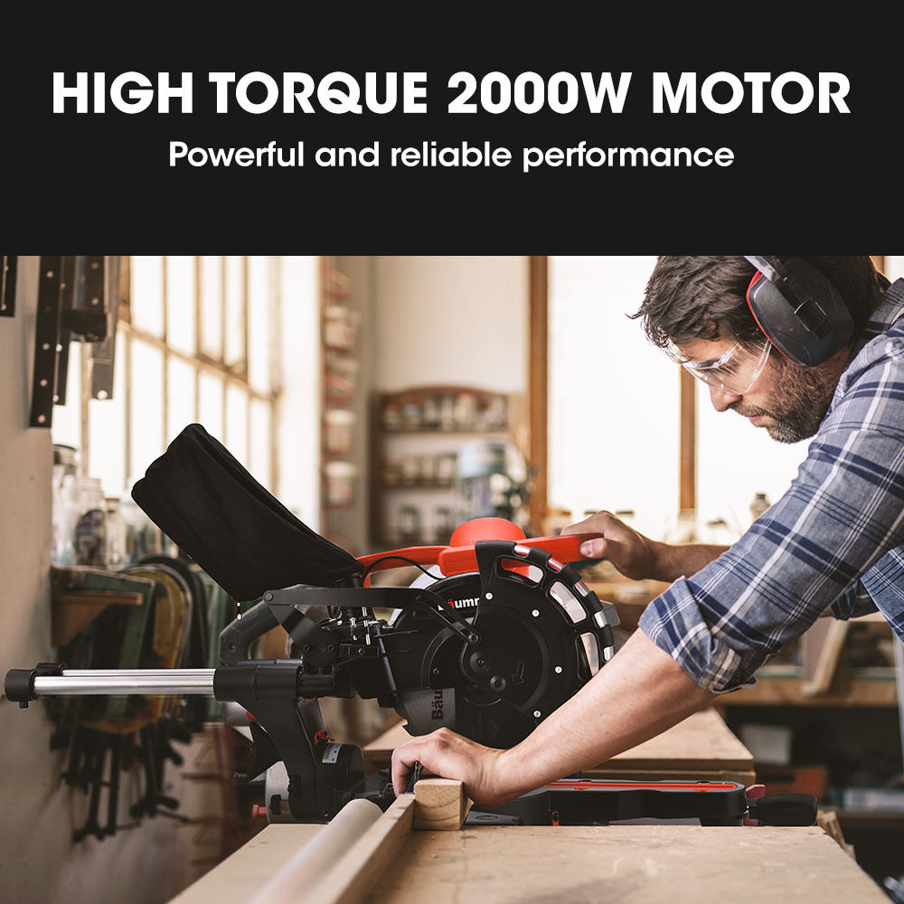 The Baumr-AG SBR-210 boasts a powerful 1500W motor. Spinning at 4500rpm it drives a 210mm tungsten carbide tipped blade for fine and perfectly flush cut. Paired with continuous sliding action on the double bearing rails allows you to perform large cross cuts with ease. The work table has positive stops on standard angles up to ±45 °. The adjustable depth limiter allows the proper mitre, bevel, groove or Dado for complex compound cutting. The Baumr-AG even has a built-in laser guide for absolute precision!