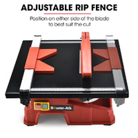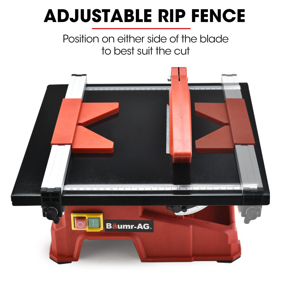The Baumr-AG Table Tile Cutter features an ultra-tough reinforced nylon base and can accommodate almost most typical tile sizes. The rip fence meets up to two measurement scales for accurate positioning. The fence can also be detached for positioning on either side of the blade for working with different tile widths. The generous table size allows you to rip-cut tiles up to 300mm in width and unlimited length!
