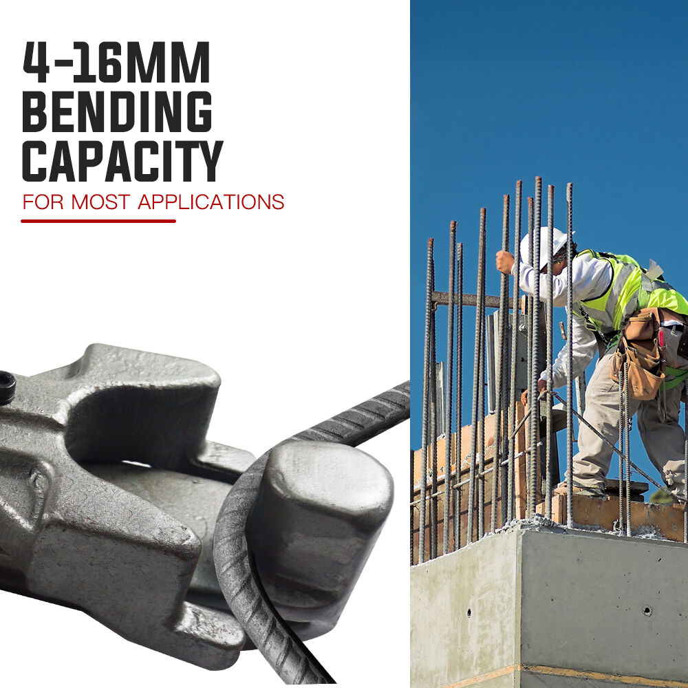 With a forged industrial strength head, the RB16B will cleanly bend rebar from 4mm up to 16mm rebar, plus chains, bolts and rods. The unit comes site ready complete with a rugged carry case and tools.