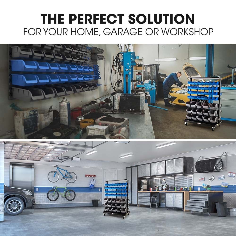 This Baumr-AG Mobile Double Sided Bin Rack makes organising, storing and retrieving loose parts and tools effortless and convenient. This 7-tier bin rack storage system is constructed from heavy-duty 20 gauge steel with a durable powder coated finish and sturdy legs. With 94 bins included it’s ideal for organising small parts and tools in a home garage, warehouse or workshop.