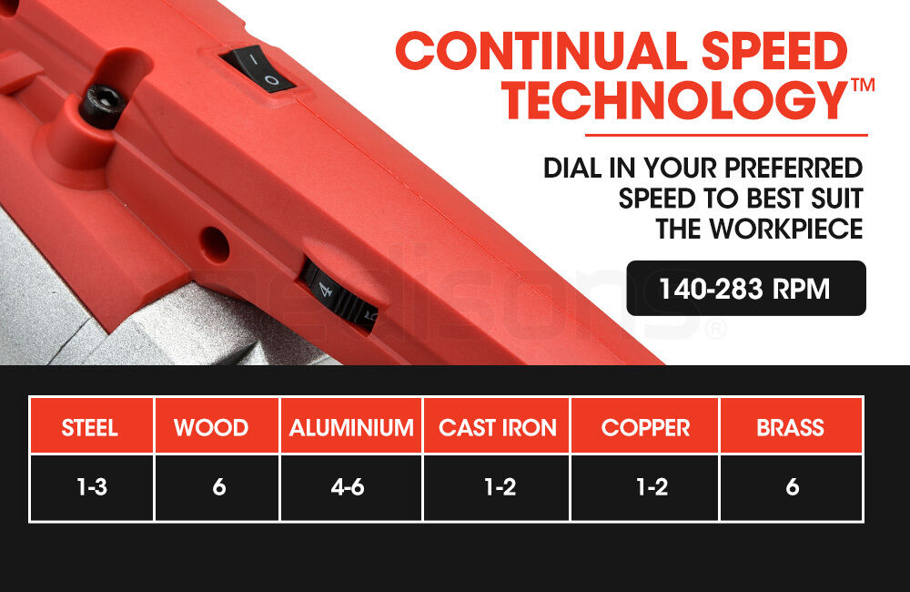 A deep throat accommodates working with workpieces of up to a large 127mm width and height, in the handheld configuration. With 6 speed operation the blade will cut through a wide range of materials including cast iron, aluminum, copper, woods and rubber; and replacement blades are readily available from Australian retailers. You’ll also appreciate features such as the tool-free blade tensioner, and the guidance light that ensures pencil markings are visible in any conditions.