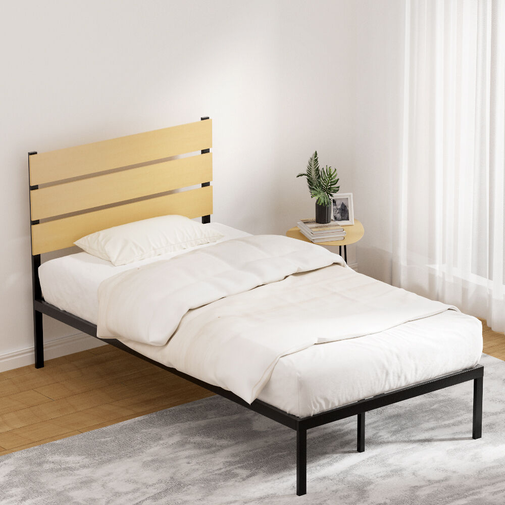$115.61Looking for an affordable bed frame that doesn't compromise on quality or style? Look no further than the PAULA Bed Frame from Artiss. This rustic-style bed frame features an enhanced powder-coated and rust-resistant steel frame with strongly reinforced steel centre slats to keep your mattress securely in place and well-ventilated. The strong centre support beams give the bed a solid weight capacity of 150kg. Topped with a solid MDF headboard, this frame creates a clean, classic look that will transform your bedroom into a pastoral-style getaway. It features ample space underneath to fit trundle drawers or other storage solutions, perfect for keeping your bedroom tidy. The simple design ensures that it will complement any bedding or decor you choose to pair it with. Fits standard Australian-sized king single mattress. Practical, functional and stylish, the PAULA Bed Frame from Artiss is an easy purchase.