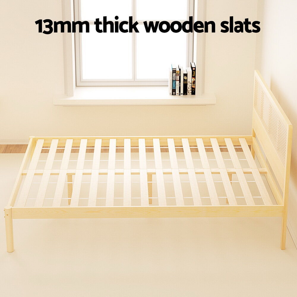 $244.39With the modern and stylish Rita Bed Frame, you can give your bedroom the perfect refresh. With its rattan bed head and smooth edges, this bed frame exudes elegance and sophistication. Crafted with a solid pinewood frame and reinforced construction, this bed frame is built to last. The sturdy wooden slats and middle support beam (for D and Q size only) provide excellent support for your mattress. The round pinewood legs add a touch of charm, while the high-quality metal fixings ensure durability. Easy to assemble and even easier to maintain, this bed frame is an ideal sleep solution for most modern Australian homes. Available in standard Australian mattress sizes, the Artiss Rita Bed Frame is the perfect choice for a comfortable and stylish sleep space.