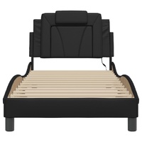 Get a better restful night's sleep from this bed frame with LED lights! It makes a welcoming addition to any bedroom. Durable faux leather: Premium faux leather is a highly durable material. It is resistant to stain, making it easy to clean with a damp cloth. The smooth surface also gives a luxurious look and the beauty of real leather.Plywood slats: The plywood slats provide good weight distribution, ensuring that the mattress stays in place with every twist and turn of your body during sleep. Excellent support: The headboard pillow is stuffed with foam for ultra-soft and optimal comfort, providing you with excellent back support while you're sitting up in bed to read or watch TV. Colourful LED strip: Bring playfulness into darkness with colourful LED lights! The hook and loop fasteners on the back of the headboard cushion can be used to secure the LED lights. Waved side design: The waved look of the bed frame is stylish and sophisticated, adding a modern and elegant touch to your decor, making it the focal point of your bedroom. Good to know:A mattress is not included with this bed. We do offer a various selection of mattresses. You can check our shop for a matching mattress.The product has a USB connector that requires a certified 5V USB power source (not included).