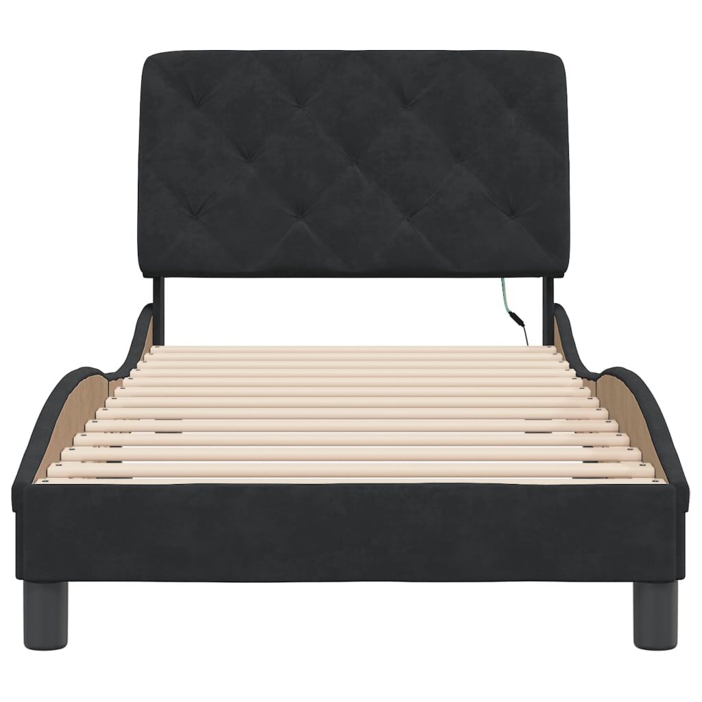 Get a better restful night's sleep from this bed frame with LED lights! It makes a welcoming addition to any bedroom. Soft velvet: Velvet is a soft and comfortable fabric that feels nice against the skin.Plywood slats: The plywood slats provide good weight distribution, ensuring that the mattress stays in place with every twist and turn of your body during sleep.Excellent support: The headboard pillow is stuffed with foam for ultra-soft and optimal comfort, providing you with excellent back support while you're sitting up in bed to read or watch TV.Colourful LED strip: Bring playfulness into darkness with colourful LED lights! The hook and loop fasteners on the back of the headboard cushion can be used to secure the LED lights.Waved side design: The waved look of the bed frame is stylish and sophisticated, adding a modern and elegant touch to your decor, making it the focal point of your bedroom. Good to know:A mattress is not included with this bed. We do offer a various selection of mattresses. You can check our shop for a matching mattress.The product has a USB connector that requires a certified 5V USB power source (not included).