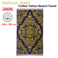 The 400gsm Mahana Multi Cotton Velour Beach Towel 100cm x 180cm by Bedding House features charming design. This towel is inspired by Oriental and Persian patterns, which are guaranteed to add a tropical vibe to your holiday. The navy and gold complement each other beautifully. The towel has an eye-catching lilac trim on the top and bottom.