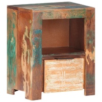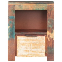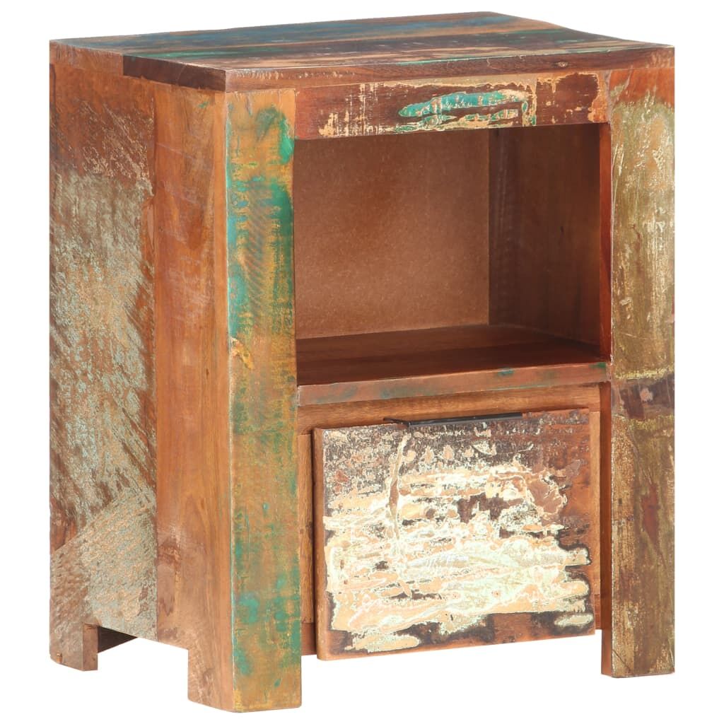 This wooden bedside cabinet is specially designed for your bedroom. The nightstand is made of solid reclaimed wood, sourced from joists, floors and support beams from old demolished buildings. It might consist of different types of wood like teak, hardwood, tropical wood, mango wood, etc. This also means the reclaimed wood retains the characteristics of these different types of wood. Reclaimed wood is already aged, weathered and dried. Hence, they don't shrink or bend. The craftsmanship and the beautiful wood grains make every piece of furniture unique and slightly different from the next. This bedside table also features a compartment and a drawer, providing ample storage space for keeping your essential items organised and within reach. Important note: Colours and grains may vary from piece to piece, making each piece unique. The delivery is random, ensuring the exclusivity and individuality of your product.
