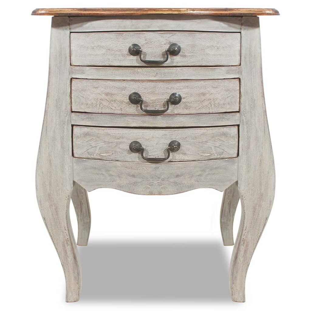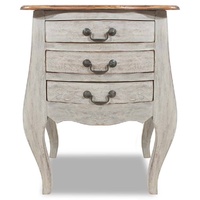 This antique-style wooden nightstand in an elegant design will add a sophisticated touch to your bedroom. Made of solid mahogany wood, this solid wood bedside cabinet is exceedingly durable and sturdy. Mahogany is a tropical hardwood, standing out with its beauty, durability and color. Special craftsmanship has been used to give this item a vintage.warm and authentic look. Every piece of furniture is unique, and slightly different from the next. Signs of wear and the craftsmanship of this fully-handmade nightstand give each piece a unique look and add to its spectacular vintage style. This side cabinet has 3 drawers with ample space for storing various items. Important note: The colour may vary from piece to piece, making each of our bedside cabinets unique. The delivery is random, ensuring the exclusivity and individuality of your product.