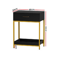 $52.63Upgrade your bedroom to the latest contemporary style with the MASON Bedside Table from Artiss. A thick board construction is topped with a black paper finish and set inside a sturdy gold metal frame, with nods to classic design eras such as Hollywood Glamour and Art Deco. Sleek metal handles and smooth metal runners slide drawers in and out with ease. The raised bottom shelf makes it easy to store your bedroom essentials in an easy-to-reach place. Floor protectors keep the unit in place and prevent scrapes and scratches on your floors. The smooth surface makes the bedside table easy to clean and maintain. With simple assembly instructions, youll be able to put together your new bedside tables in no time. Elevate your bedroom today with the inspiring MASON Bedside Table from Artiss.