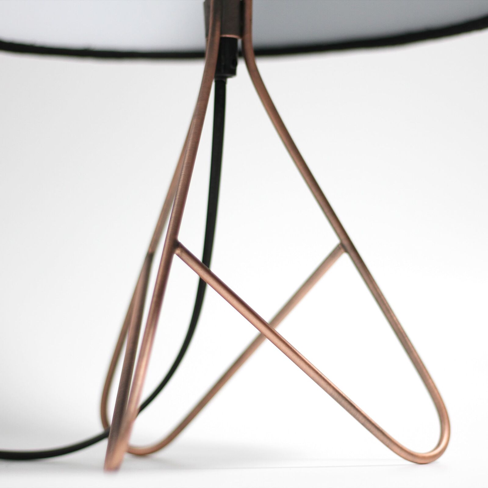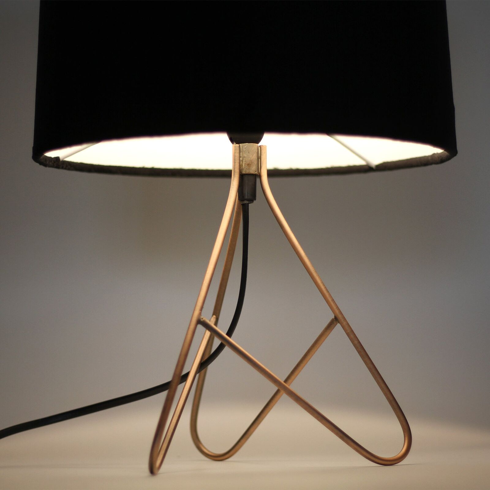 The Belira Table Lamp offers a modern design that can fit seamlessly in most home decors. The base of the Belira provides the contemporary character with a metal bar curved and shaped to make for an attractive and sturdy lamp foundation. The black traditional drum style lampshade is a pleasing contrast to the base, which comes in antique brass or copper.