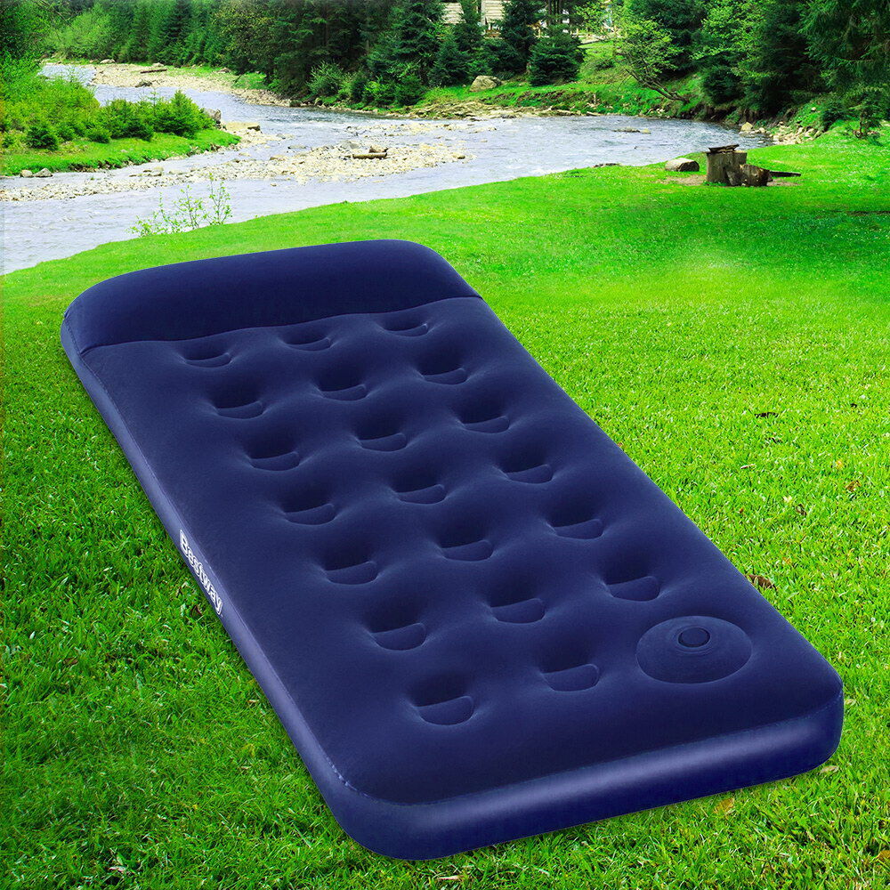 Featuring a comfortable flocked sleeping surface, the single size air bed provides a smooth and comfy sleep each and every night. Combined with a sturdy coil-beam construction and 30cm thick built-in pillow, this quality air bed is suitable for both indoor and outdoor use. You will have an instant bed ready to go whenever the situation calls for a spare mattress. Portable, easy to store and effortless to set up, this convenient air mattress provides the perfect balance of comfort, practicality and affordability.