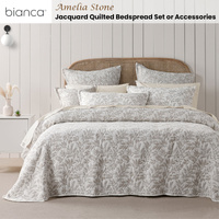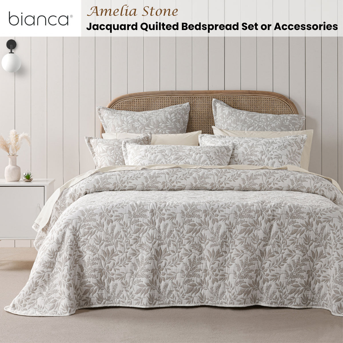 Delicate foliage in a soft stone and white colour way completely encompasses the entire bed. This stunning jacquard design pops on a crisp white background. Finished with a classy cuffed edge, Ameila Stone Jacquard Quilted Foliage Bedspread Set by Bianca is the perfect bedspread for your home. Complete the look with matching accessories.