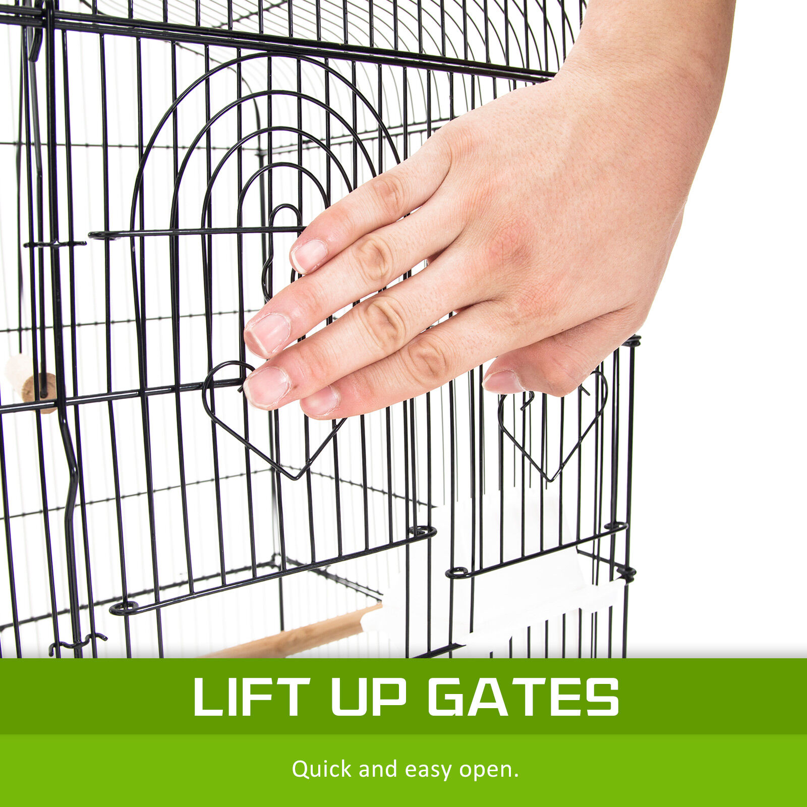 The cage's frame is made of durable and high-quality wrought iron and it is powder coated in order to prevent it from rusting and offer a longer service life. The cage could have 2 different shape arrangement(Full / Half Cage), suitable from small to medium size birds as well as you could match up with your spaces and furniture. Dual front access door so you can keep your bird safe and have easy access inside the cage. 4 feeder cup and 2 rest wooden perches and a swing perche that add a little bit of fun for your lovely birds.