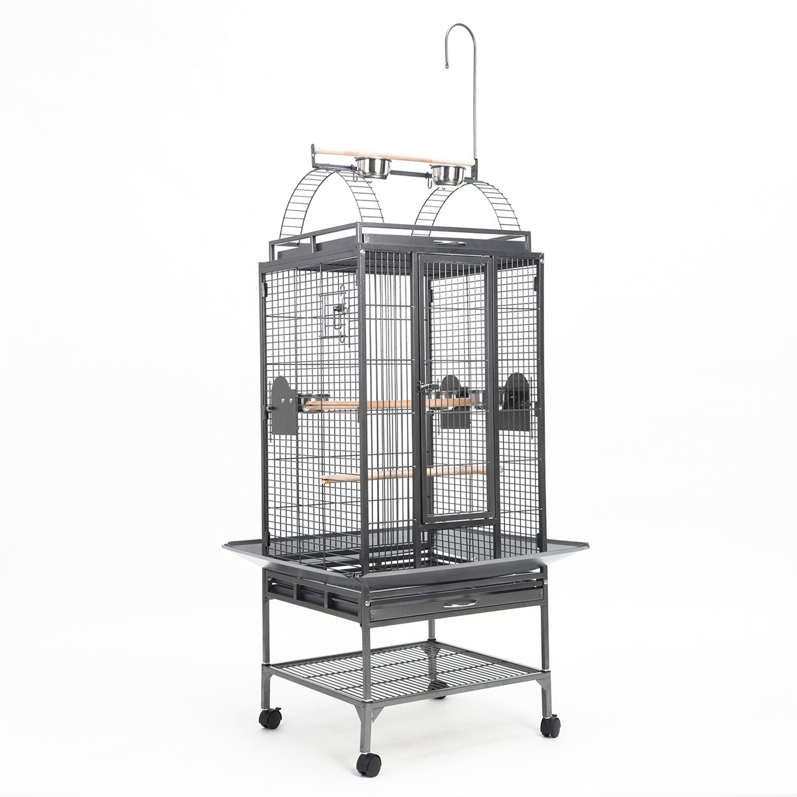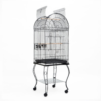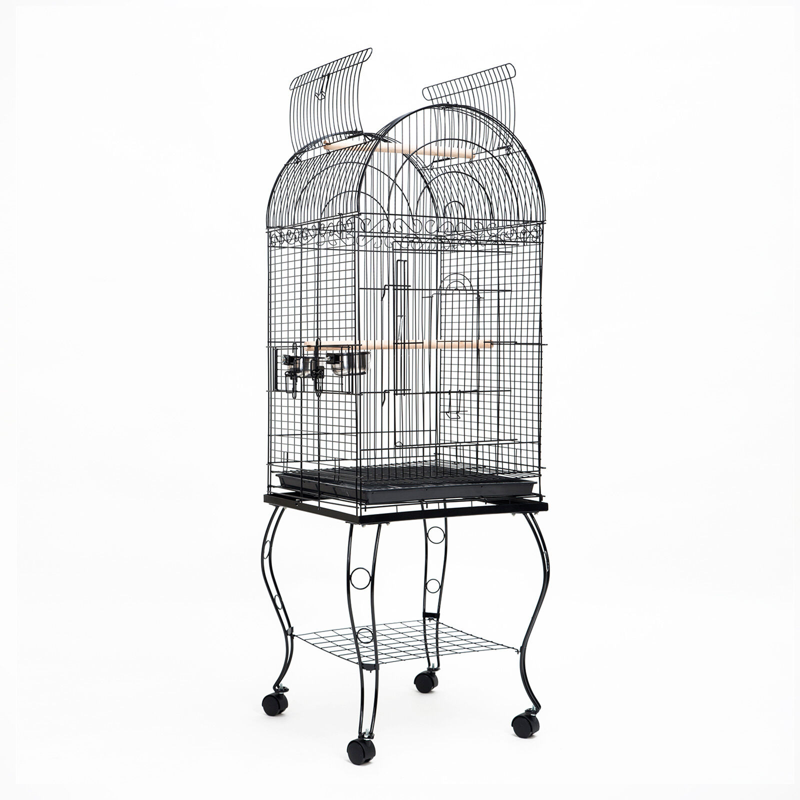 This stylish and practical Heavy Duty Large Bird Cage Dome with openable top and castor Wheels is the perfect solution for you if you need somewhere comfortable and safe for your loved bird to stay in. The cage suits small to medium sized birds (parrots, budgies etc.) It is made with high-quality materials, easily movable and very easy to assemble.The cage's frame is made of durable and high-quality wrought iron and it is powder coated in order to prevent it from rusting and offer a longer service life. There is one lockable door on the front and one on the top of the cage so you can keep your bird safe and have easy access inside the cage. There is also a removable tray under in order to make cleaning easy. There are four, 360 degree swivel caster plastic wheels so relocating the birdcage is very easy. 2 water/food container and 2 rest wooden perches are included. The cage also has a clever shelf under it so you can store your birds' needs, such as water, food and cleaning tools. Another good feature is that the bird dome on top is removable from the stand so you can place it on top of tables or other places.Come grab one of this great bird cages and enjoy their beautiful singing sound!