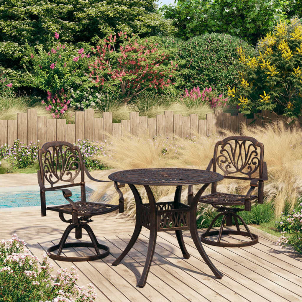 $519.81This bistro set, made of cast aluminium, provides a comfortable seating experience for you and your guests. The outdoor chairs and table, made of cast aluminium, are both sturdy and durable. The rust-resistant and weather-resistant material makes the furniture set ideal for outdoor use. These outdoor chairs feature stable round bases that allow for a smooth and comfortable swivelling motion so that you can sit at any angle. The beautiful patterns make the bistro set an elegant addition to your outdoor space. Additionally, the coffee table has an umbrella hole that can perfectly accommodate your umbrella to protect you from sun or rain. Note: In order to extend the life of your outdoor furniture, we recommend you to clean it regularly and do not leave it outdoors without protection unnecessarily.Clean: Use a mild soap solutionStoring: If possible, store in a cool, dry place indoors. If the product is stored outdoors, protect it with a waterproof cover. Wipe and dry the excess water or snow from flat surfaces after a rain or snowfall. Allow sufficient air circulation to avoid moisture-related damage.