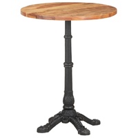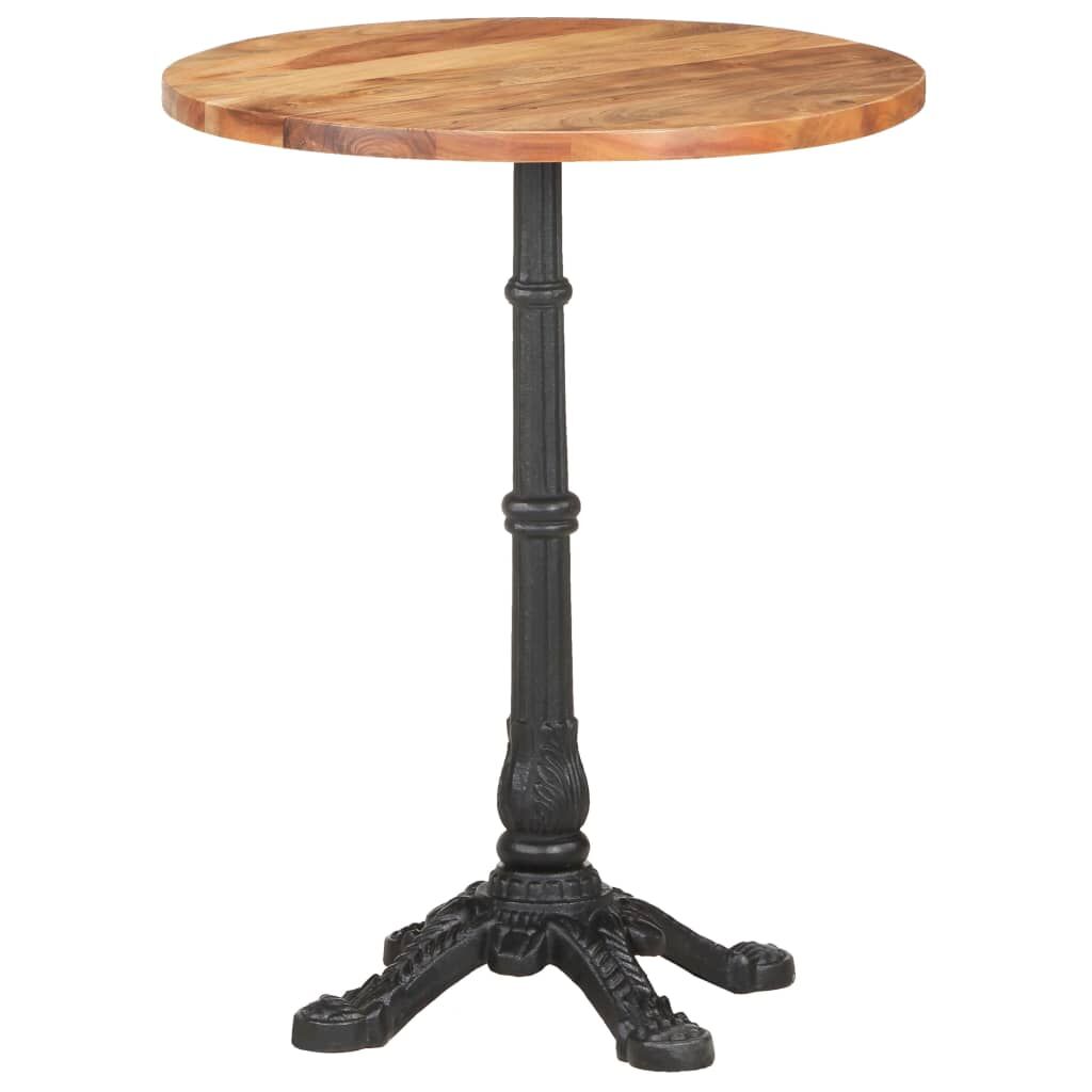 Add a touch of romantic atmosphere with this wooden bistro table! The tabletop is made of solid acacia wood, making it sturdy and stable. The cast iron base provides stability and sturdiness for it. This dinner table even serves as a table to place your drink or any other necessity you need close at hand. Important note: Colours and grains vary from piece to piece, making each piece unique. The delivery is random as well.