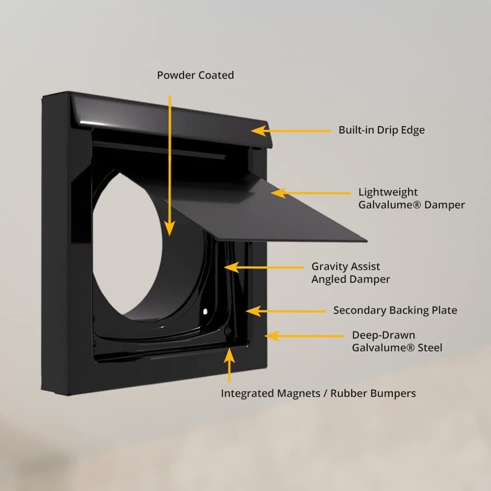 Black 4-Inch Dryer Vent Cover Outdoor Wall Exhaust for Clothes Dryer Bathroom Fan | Durable Galvalume Steel with Quiet Damper