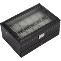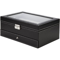 Black Leather Watch Box Jewelry Display Case with Drawers (12 Slots with 2 Layers)