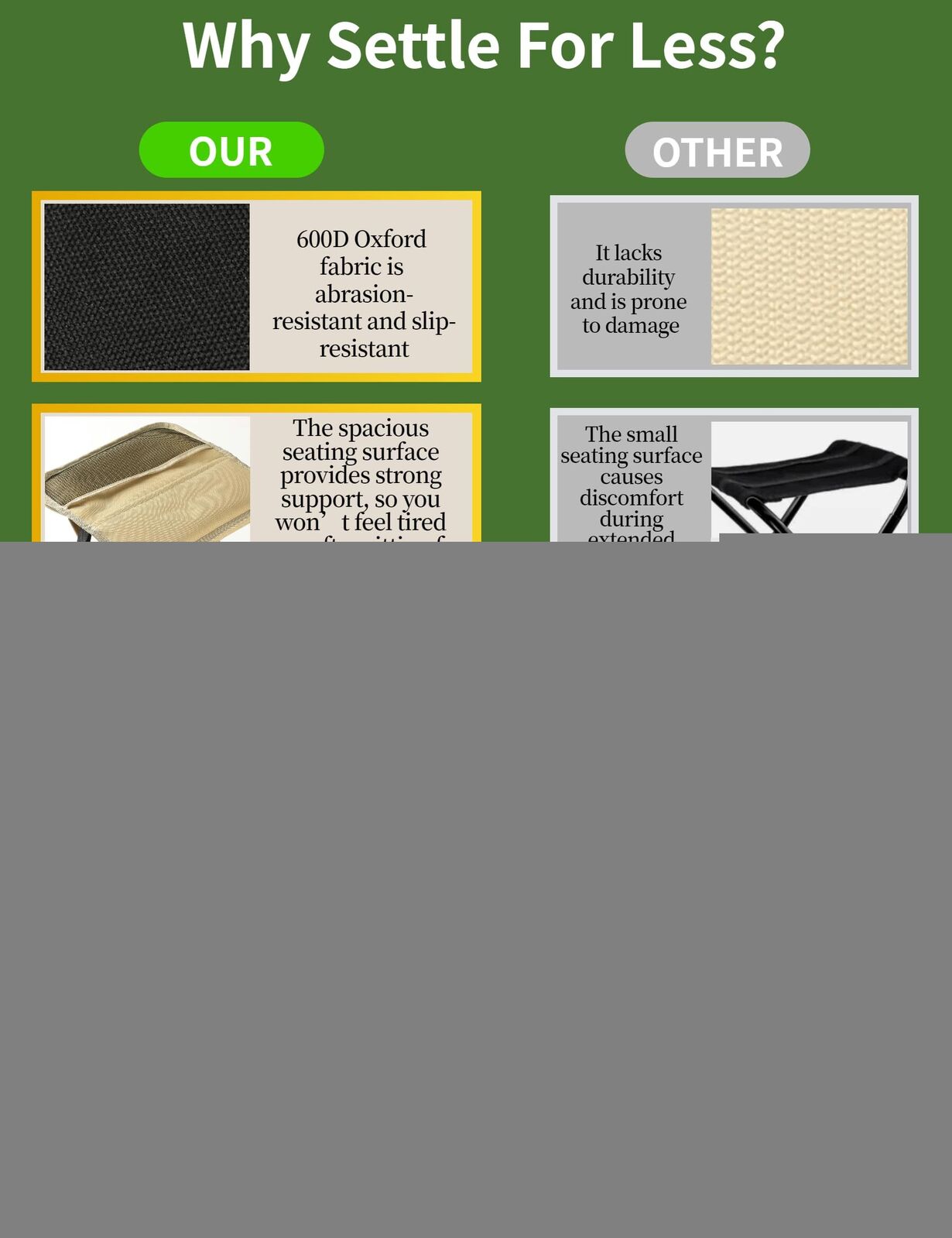 With a maximum load capacity of 270 lbs (122 kg), its strong enough for adults yet compact enough for kids to carry. Its X-shaped frame ensures balance and prevents wobbling, while anti-slip foot pads protect floors and prevent sliding. Perfect for camping, hiking, fishing, tailgating, beach outings, or simply resting during long walks.