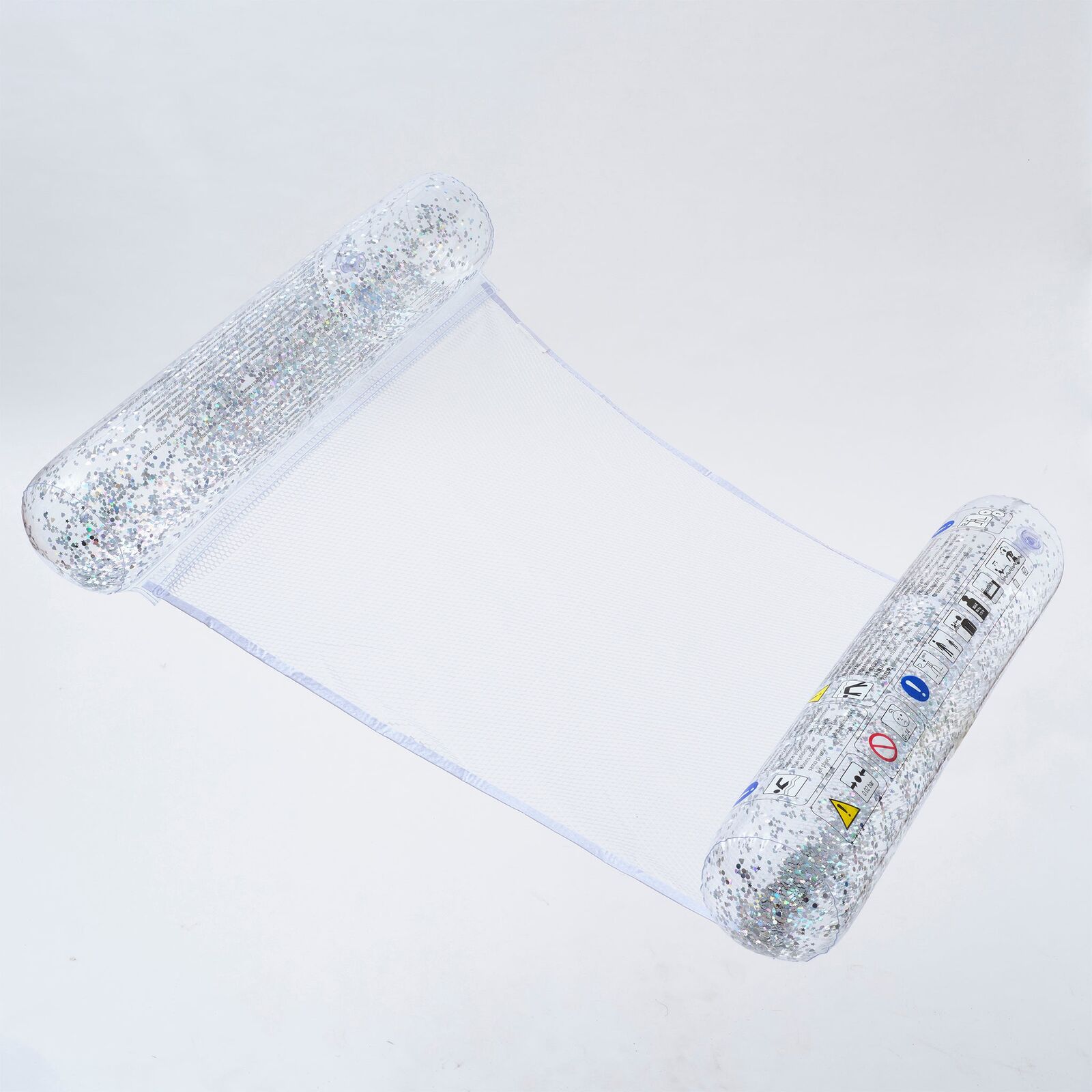 Lay back and chill this season with the Glitter Bolster Hammock. It is super cool, comfortable and fun, perfect for poolside and seaside floating. Featuring a net centre with an inflatable pillow on either side and the option to sit or recline, this 2-in-1 inflatable is set to glisten and shine all year long. Bring some added sparkle to your life with its transparent and silver holographic confetti design that will elevate your summer style.