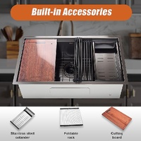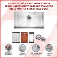 $645.77This WORKSTATION sink from BRIENZ maximizes the functionality of your kitchen sink by adding built-in accessories that slide on integrated ledges built into the sink. Includes a deep STAINLESS STEEL COLANDER that you can also use as a caddy for your dish soap and sponge. The solid CUTTING BOARD is constructed of luxurious hardwood that has a beautiful dark finish. The sturdy stainless steel FOLDABLE RACK sits on the track and is ideal as a dish drying rack.